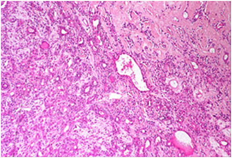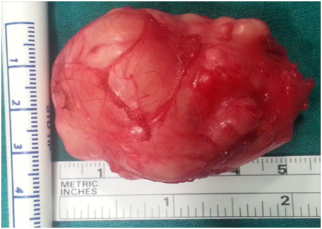 The gross specimen was 6x4x5 cm3 in dimensions and had characteristics of well-demarcated, encapsulated, and uniformly soft with smooth edges (Figure 3) and confirmed on histopathology as pleomorphic adenoma (Figure 4). Since the surgery the patient has been asymptomatic. The follow-up examinations did not reveal any signs of complication or recurrence in 2 years of follow up and still we are following up the patient.