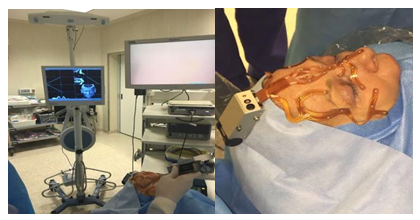 In some patients, for the lateral technique, the anterior third of the middle turbinate was then resected bilaterally. The antero-superior sector of the nasal septum, between both ostiums, was removed creating a common cavity for drainage of the frontal sinus. The obtained limits were, laterally both lamina papyracea of the ethmoid bone, anteriorly the nasal bones and posteriorly the cribiform plate and posterior wall of the frontal sinus. Fig.1 In other patients, the medial technique (outside-in) was performed: a mucosal flap was dissected anterior to the medial turbinate, on the frontal processes of the maxilla to identify the first olfactory nerve fiber. An anterior and superior septectomy, of approximately 1 centimeter, was made, and the frontal sinus was then approached in the most anterior part, by drilling the nasal bones. The drainage was extended to the posterior part of the sinus and laterally to both lamina papyracea. Medtronic Integrated Power Console lathe was used with diamond and cutting burrs of different diameters, curettes and a Kerrison-type rongeur. The mucosa of the lateral wall of the frontal sinus (lamina papyracea), responsible of the mucociliary transport, was preserved. A septal mucosal-free graft was used in some patients to cover the exposed bone anterior part of the sinus. The optical neuronavigation system was used in most of the patients ((Figure 1, Figure 2).
