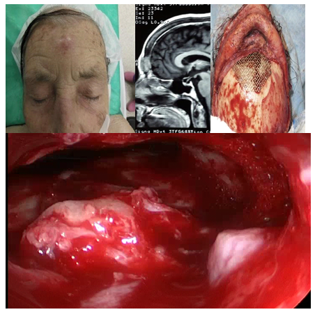 Sixteen patients, seven women and nine men were treated, going from 24 to 90 years old (With an average age was 56 years). The etiologies of the diseases that affected the frontal sinus were: allergic fungal sinusitis (2/16), Recurrent frontal mucocele with a history of Draf 2 (3/16), frontal mucocele relapsed to external surgery with obliteration (1/16) frontal mucocele, nasal polyposis and cystic fibrosis (1/16), frontal sinusitis due to previous surgeries (4/16), frontal mucopioceles (2/16) and malignant tumors originating in the ethmoid and frontal sinus (3/16). Five patients had a history of transnasal surgeries with endoscopes: one was operated 11times and another three times for an allergic fungal rhinosinusitis. Another patient was operated on two opportunities because of a frontal mucoceles, and 2 patients underwent throw several endonasal surgeries and combined with external approach. Four had surgeries performed by external approaches, by mucoceles frontals, odontogenic myxoma and frontal sinusitis complication.