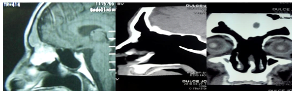 In three, the modified Lothrop technique was used to expand the margins of oncology resection due to malignant tumors that that compromised the recess and the frontal sinus. In one it was combined with an external approach. We used the optical neuronavigation system in three cases (Figure 3 & Figure 4). In 12 patients, the sinus was approached through its ostiums (inside-out), and in 4 cases the frontal sinus was drained starting from the frontal recess floor in the midline (ouside-in). One patient had a cerebrospinal fluid fistula as a complication, which was detected and repaired with free grafts with multilayer technique in the same surgical time. One patient had unilateral frontal headaches 5 years after the Lothrop modified technique surgery. A unilateral blockage of frontal drainage was identified by mucosal hyperplasia caused by its allergic fungal sinuistis (Figure 5). It was operated again by transnasal route and the sinus was permeabilized. Another patient had a complete obliteration of the frontal drainage 1 year after surgery. It was operated again with modified Lothrop technique and it was possible to wide the frontal recess drainage pathway. The other patients had a permeable frontal drainage and were asymptomatic during the average follow-up time of 3.5years. The permeability of the frontal drainage obtained with modified Lothrop technique was 87.50% (14/16), and with rescue endonasal surgery, the permeability was 100%.