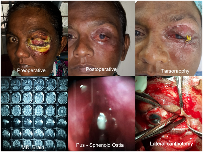 ethmoidal, frontal and sphenoidal sinuses and endoscopic removal of medial orbital wall was done by removing lamina papyracea from superior aspect of maxillary ostia to the superolateral part of the roof of sphenoid sinus, the left orbit entered beyond orbital fat till medial rectus to decompress it adequately into nasal cavity and sphenoid sinus by removing almost entire lamina papyracea and into roof of maxillary sinus by removing inferio-medial wall of the orbit. Sphenoid sinus opened widely up to orbital apex and optic nerve decompressed by incising along its sheath. In addition, lower eyelid wound debridement along with lateral canthotomy was done. Her eyesight improved postoperatively and she underwent staged tarsorrhaphy later on.