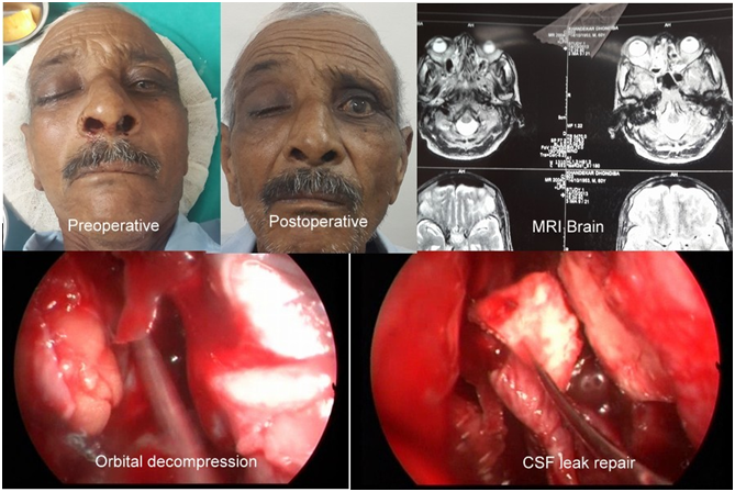 Postoperatively patient had favourable recovery with return of flickering movements in his upper eyelid and some perception of light in his operated eye. He had no signs of any CSF leaks and serial nasal endoscopy showed good healing and mucolisation of nasal cavity with no CSF leaks even on straining.