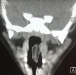 Figure 1 Computed tomography revealed a tumor of 2.5 cm by 0.5 cm pedicled to the left lateral wall of the cavum that fell towards the supraglottis.