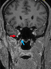 Figure 1 Magnetic resonance imaging, T1-weighted sequence with fat suppression. Coronal slices showing anomalous contrast enhancement in the foramen rotundum (red arrow) and pterygoid canal (blue arrow).