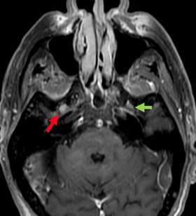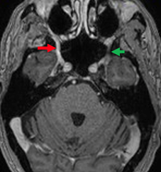 Figure 2 Magnetic resonance imaging, T1-weighted sequence with fat suppression. Axial slices showing anomalous contrast enhancement in the right foramen rotundum (red arrow), normal on the left (green).