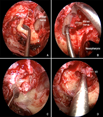 Figure 3 Transnasal exposure (zero-degree endoscope) of pterygopalatine fossa and sphenoid sinus on the right. A: Identification of the foramen rotundum and pterygoid foramen after partial resection of the structures of the pterygopalatine fossa; B: vidian nerve resection; C and D: opening of the foramen rotundum and exposure and undermining of the maxillary nerve up to the cavernous sinus.