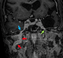 Figure 4 Magnetic resonance imaging, T1-weighted sequence with fat suppression. Coronal slices showing thickening and contrast enhancement in the right mandibular nerve (CN V3) at the level of the foramen ovale (blue arrow) and as it courses infratemporally within the masticator space (red arrow). The green arrow points to the normal contralateral foramen ovale for comparison purposes.