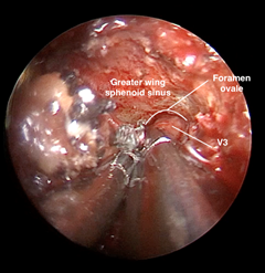 Figure 6 Transnasal exposure (zero-degree endoscope) of the foramen ovale after dissection of the greater wing of the sphenoid on the right.