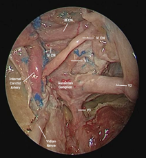 Figure 7 Transnasal dissection (zero-degree endoscope) of the Meckle’s cave in the left side. Trigeminal nerve, route of the perineural spread in the skull base.