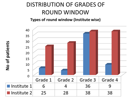 There were a total of 55 patients in institute 1. Out of which grade I, II, III, IV types of round window was seen in 6 (10.9%), 4(7.27%), 36(65.45%) and 9(16.36%) patients respectively. Institute 2 had 129 patients who underwent cochlear implantation during this period. Of these 129 cases 25(19.37%), 28(21.70%), 38(29.45%) and 38(29.45%) patients had grade I, II, III and grade IV type of round window membrane visibility respectively. Grade III was the most common type of grade among patient population in both the institutes.(Figure 5) The total distributions of various grades in patient population of both the institutes in two parts of the country were not statistically different from each other (p=0.4, Mann Whitney U=3282, z=-0.842)