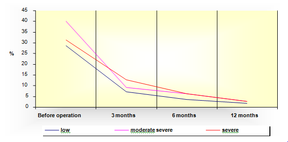 Graphic 6b Distribution of frequency of severe nasal symptoms before operation and 3, 6 and 12 months after operation.