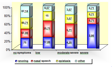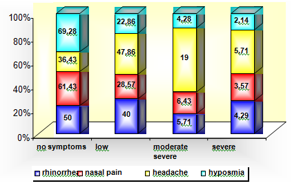 Distribution of accompanying nasal symptoms in patients-candidates for Rhinoseptoplasty (RSP) according to the rate of severity of nasal symptomatology.
