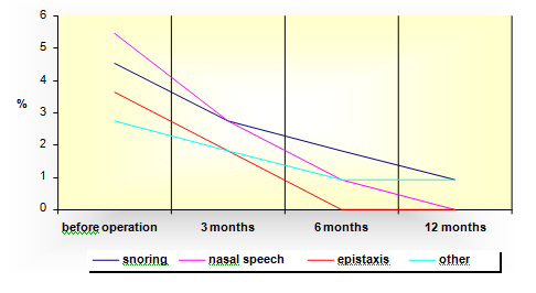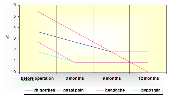In this part of the research we have presented the results obtained by analyzing patient's nasal symptoms before the operation and one year after the operation, that is, 3, 6 and 12months after the operation.