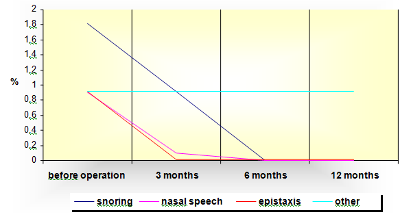 The results from the research have shown that before the operation and at 3, 6 and 12month check-up, the lowest was the percentage of respondents who felt the nasal obstruction as mild and it didn’t interfere with their everyday activities and sleep. It is almost a constant and it is dominant in all the rates of nasal obstruction, but because it is of a “bony” type, that is, because of the deviation of certain segments of the nasal septum (cartilaginous or bony) it shows drastic reduction after the operation. In the evaluation of this symptom before the operation and one year after the operation reduction in all three intensities was registered. The highest percentage of nasal obstruction reduction was with moderate intensity in 37.3% of the respondents.