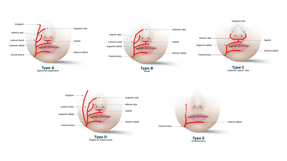 Figure 1 Anatomical variations of terminal branches of the facial artery, five types A to E. Loukas M, Hullett J, Louis RG Jr, et al. A detailed observation of variations of the facial artery, with emphasis on the superior labial artery. Surg Radio Anat. 2006 Jun;28(3):316-24.