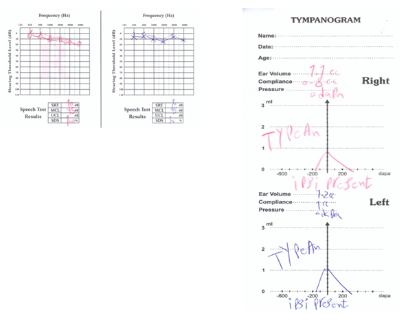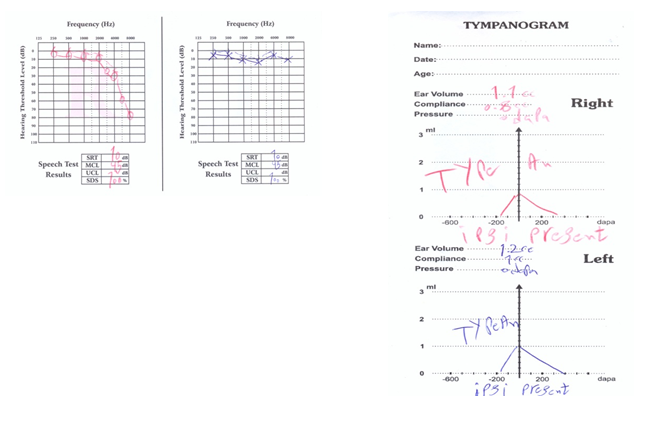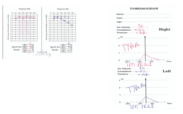In conductive hearing loss, acoustic reflex is absent. In this patient, acoustic reflex was present at 500Hz, 1KHz, 2KHz and 4KHz, which was very sharp (Figure 1).