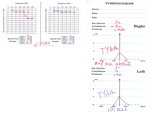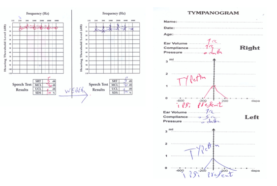 In audiometry, left ear was normal, but there was a conductive hearing loss at high frequencies in right ear. I should concede that I was mistaking to diagnose this hearing loss at high frequency as acoustic trauma or sudden sensorineural hearing loss, but otoscopy of right ear indicated red tympanic membrane and diapasonic Weber test lateralized towards right ear both support conductive hearing loss in right ear.