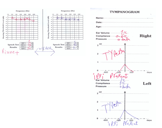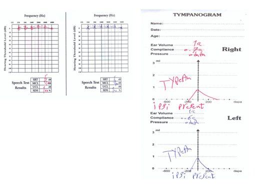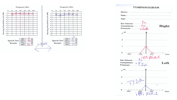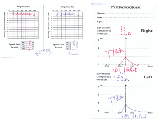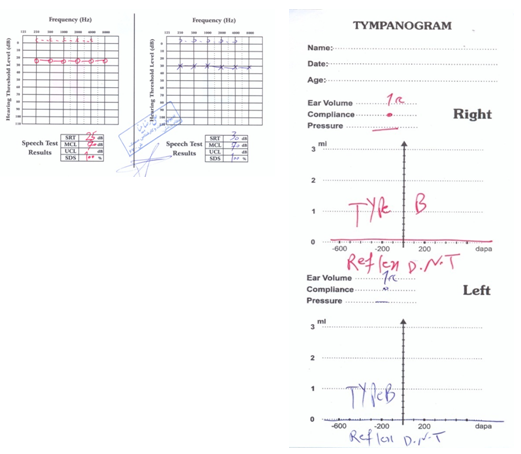 By changing the antibiotic and prescribing other drugs, in next session, redness of tympanic membrane disappeared in both ears. In tympanometry, SC became 0.7cc and 0.6cc in right and left ears. Acoustic reflex was present in both ears and air bone gap was completely disappeared in both ears in audiometry (Figure 5-7).