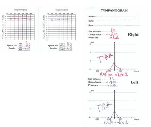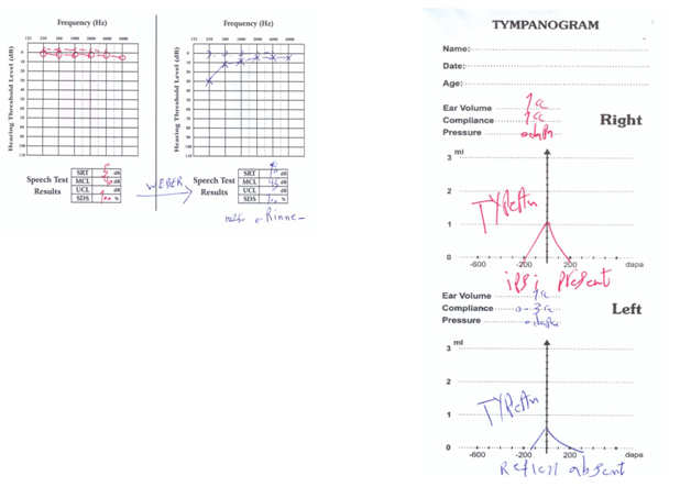An adult patient referred to our clinic, complaining of hearing loss and left ear fullness. In otoscopy, right ear was normal, but left tympanic membrane and malleus were completely red. Tympanometry of right ear was Type An and acoustic reflex was present in right ear. In left ear, tympanometry was Type An with SC of 0.3 cc and acoustic reflex was absent.8
