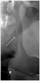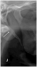 Figure 2 Type II, styloid process joining the stylohyoid ligament by a single pseudo-articulation (Radiograph from More CB & Asrani MK.10)
