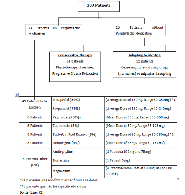 Thus, 74 patients received prophylactic medication and 26 received non-drug treatment (Table 1). Of these, 14 received conservative treatment and 12 had to change their lifestyle. Of these 74 patients, 10 exercised regularly, 8 had progressive muscle relaxation and 9 people changed their lifestyles. It is also worth noting that many of the patients studied used other medications that may interact with the therapeutic test medication: contraceptives, iodine, proton pump inhibitors, insulin, thyroxine, anticoagulant, hydrochlorothiazide, losartan and statins.