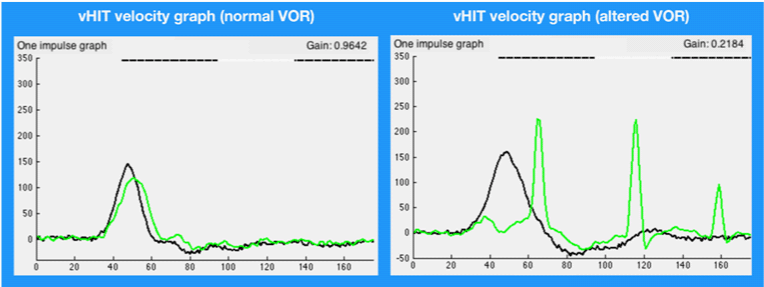 Figure 1 vHIT velocity graphs. On the left graph the head velocity (plotted in black) obtained with the head impulse is followed by a similar (in absolute values) eye movement (plotted in green). In the right plot, eye velocity does not follow the head movement and three movements are recorded (refixation saccades) after the head movement has been finished. Y-axis: velocity in deg./s. X-axis: time in (hardware) samples.