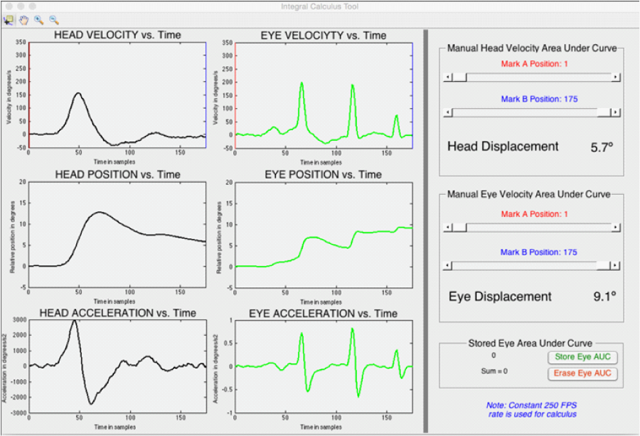 As result of this study an Integral Calculus Tool GUI was developed using MATLAB. The GUI was fully operative and its main functions are: velocity vs. time plots, position vs. time plots and acceleration vs. time plots for eye and head movement, interval selection for area under curve calculation, accumulative area under curve calculation. In the test of the Integral Calculus Tool with normal subjects (n=5) the same displacement was measured in head and eye movements. Head displacement (area under impulse curve)=8.36 degrees (SD: 0.23), eye displacement (area under impulse curve)=8.17 degrees (SD: 0.52). In the test with patients (n=5) with detected saccades, the same displacement was measured in head and eye movements. Head displacement (area under impulse curve)=7.98 degrees (SD: 0.35), eye displacement (area under impulse and area under post-impulse)=7.52 degrees (SD: 1.03). These position and acceleration data obtained with the Integral Calculus Tool GUI were in the same value ranges of the values published by other authors.6