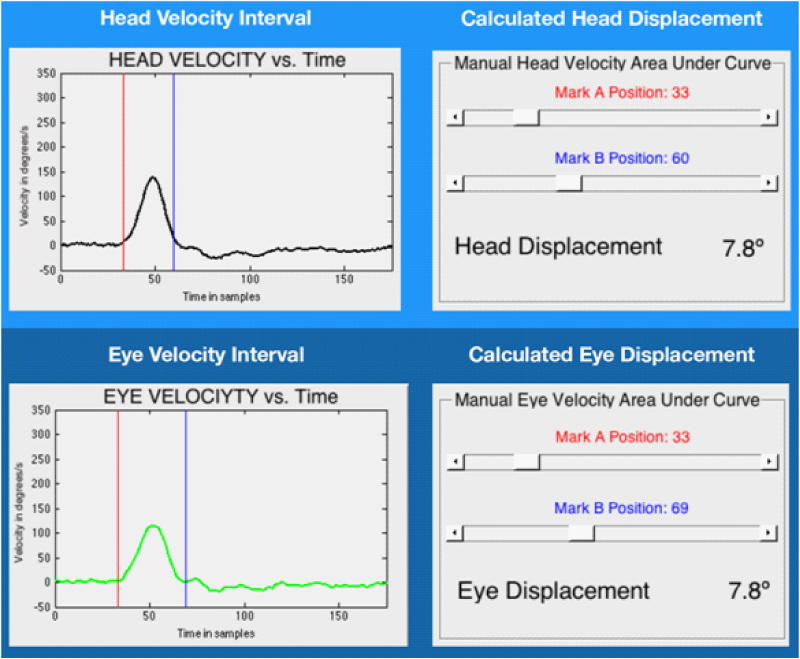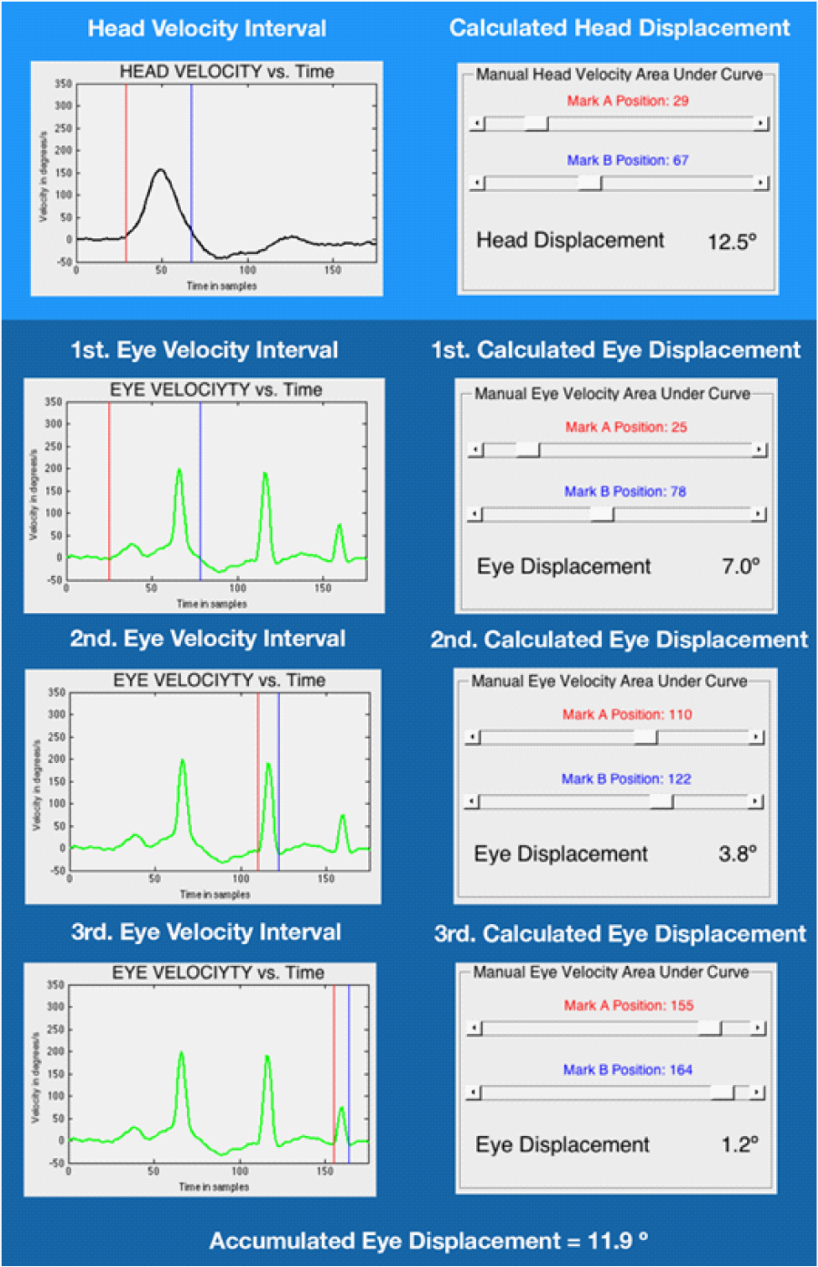 The possibility of determining intervals to analyze the graphics is an important feature of the developed GUI. With this feature the user can select and specifically compare the movement during head impulse and eye movements that want to analyze. In certain records may exist head movements (such as overshoot) that does not interest us to analyze, at other times the vHIT can record very low speed movements appeared after the head impulse that the user neither want to analyze. The interval selection feature makes possible that all these movements can be analyzed separately. It has been shown that saccades are one type of compensatory responses aimed to reduce retinal smear during head movements in patients with a deficient VOR.10,11 With the methodology developed in this article we can measure the efficiency of this compensatory mechanism from the data obtained using the vHIT in a small sample of impulses. This methodology can be used in further studies to characterize the saccadic responses on patient with altered VOR. This Integral Calculus Tool GUI has been incorporated in our vHIT advanced analysis software: HIT Cal. The HIT Cal source files are available on web: http://mlibra.com.