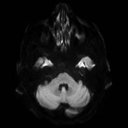 In the ED he presented with gait instability, diffuse tremor, rigidity and dysarthria. During ED observation, he developed vertigo, followed by an acute confusional state requiring sedation with midazolam and diazepam. Vital signs were in normal range, he was apyretic; a head computed tomography (CT) was performed, showing signs of moderate leukoaraiosis. In suspect of Wernicke’s encephalopathy (WE) treatment with intravenous thiamine was started. A brain MRI was performed and no ischemic lesions were found, other than chronic microangiopathic lesions in the white matter of both cerebral hemispheres. However, a subtle hyperintensity in Fluid Attenuated Inversion Recovery (FLAIR) (Figure 1), with a dubious diffusion weighted imaging (DWI) (Figure 2) signal hyperintensity at the cerebellar nodulus was found; apparent diffusion coefficient (ADC) sequence was negative (not shown).