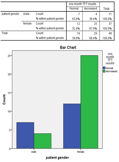Within the first one month, 60.4 % of the cases developed hypothyroidism. Of them, 2 patients (7.5%) return to normal thyroid function within six months post operatively. By six months, a total of 27 out of 48 patients (56.3%) were hypothyroid. None of these patients’ thyroid status improved later on. The other 43.8% found to be satisfied with their gland’s remnants without any need for supplementation.