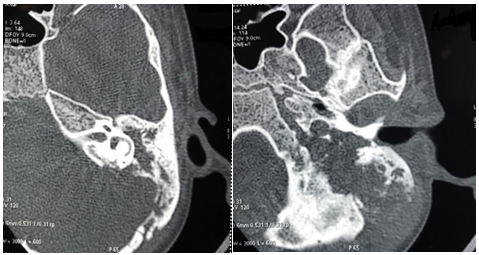 Figure 1 High Resolution Computed Tomography of temporal bone: Erosion of squamous part of temporal bone, clivus and mastoid part of temporal bone on left side.