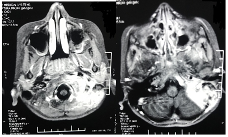 Figure 2 Post contrast Magnetic Resonance Imaging of brain: Destruction of mastoid part of temporal bone with erosion of squamous part of temporal bone and thrombosis of left sigmoid sinus and left internal jugular vein.