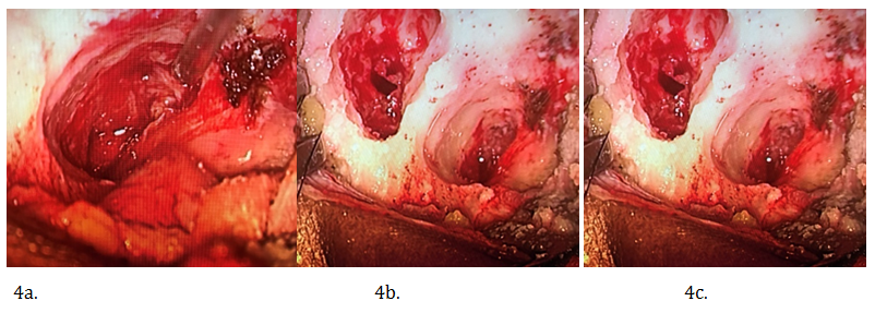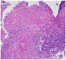 Patient was posted for immediate surgery under antibiotic cover. A left modified radical mastoidectomy was done. Peri-operatively granulations were seen in the middle ear along with soft tissue growth seen in external auditory canal and hypotympanum extending to mastoid cavity and eustachian tube. Infected left sigmoid sinus and internal jugular vein thrombus was evacuated (Figure 4a,4b ,4c). Intra-operative swabs collected for Acid fast bacilli, culture and sensitivity and Zeil-Nelson staining reported negative. Histopathology report of biopsy of middle ear granulations revealed multifocal epitheloid granulomas, multinucleate histiocytic giant cells and abundant lymphoplasma cell infiltrate with caseous necrosis (Figure 5). Postoperatively, patient was immediately started on antitubercular therapy in addition to adjunct treatment with cervical collar stabilization. Within two weeks of starting antitubercular therapy, patient showed remarkable recovery with disappearance of otologic complaints and relief of neck pain. Patient maintained regular 3-month follow-up which showed well epithelialized cavity with no recurrence.