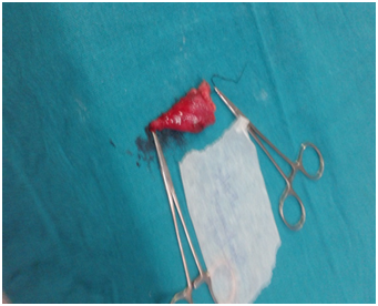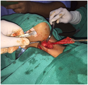 CECT neck was done which confirmed the diagnosis. The patient was prepared for surgery under general anesthesia. An elliptical incision was given around the opening and flaps were raised. Around 20-30ml pus was drained. The tract was traced and found passing between internal and external carotid arteries and was opening into tonsillar fossa. Fistula was excised completely and sent for histopathology examination. Post-operative period was uneventful and wound was healthy. Excision of fistulous tract (Figure 2 & 3).