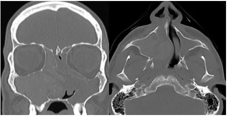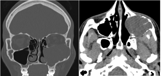 A-Coronal CT: an expansive lesion in the right maxillary and ethmoid sinus that displaced the nasal septum, and a descent of the left orbital floor is observed, B- Axial CT: a collapse of the left maxillary sinus walls is observed.