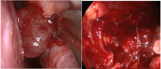 Nasal endoscopy revealed polyps in the right nasal cavity and abundant mucous secretions and a septal deviation in the left nostril that blocked the passage of the endoscope.