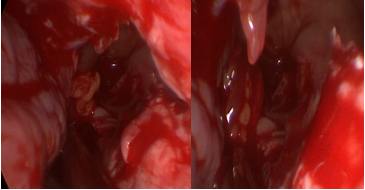 By endonasal approach with endoscopes, an arterial bleeding from the roof of the left maxillary sinus was observed. It was very difficult to access and cauterize the IOA by the Prelacrimal approach, therefore an anterior maxillary sinusotomy was performed.