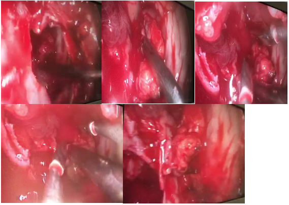 Surgical treatment was indicated. By an endonasal approach with endoscopes, the mucosa and medial capsule of the tumor were resected aspirating myxoid content (Figure 3).