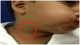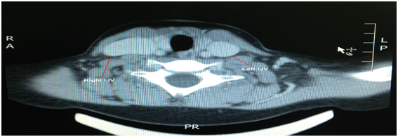 A ten year old male with no particular past medical or surgical history presented with history of right neck intermittent swelling since long time. This swelling became more prominent the past 4years. Parents noticed this swelling since early childhood, which was according to them increasing in size during coughing, straining, and any other Valsalva like manoeuvre. This swelling was occasionally associated with non-alarming shortness of breath while sleeping, especially when the child has an upper respiratory tract infection. He has been frequently seen in different hospitals for the same, and the parents were worried because of no definite diagnosis was made. On physical examination, he was generally healthy boy, with no dysmorphic features. Neck examination at rest showed no abnormality, however; on performing valsalva manoeuvre the swelling started to appear in the right side of the neck anterior triangle and posterior to the SCM muscle (Figure 1). On palpation there was fullness in the right side anterior triangle of the neck which was pushing the SCM slightly anteriorly. The mass was about 4x5cm, smooth surface with well-defined anterior surface, not warm, not tender, and not pulsatile. The mass completely disappeared when the child is relaxed. On the other side of the neck there was no swelling appreciated (Figure 2). Computed tomography revealed dilatation of right internal jugular vein, more toward the inferior part of the vein. There was no mass causing compression or obstructing the drainage of the vein (Figure 3).