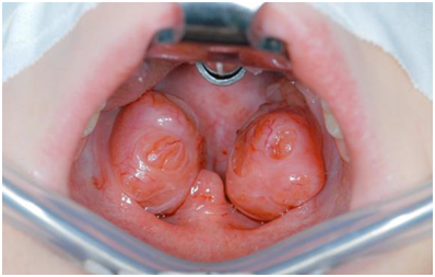 Tonsil hyperplasia, also known as (idiopathic) tonsillar hypertrophy, refers to abnormal enlargement of the palatine tonsil.5,6 It has to be distinguished from physiological pediatric palatine tonsil hyperplasia7,8 which is not a sign or consequence of recurrent inflammation.9,10 Also, children with tonsil hyperplasia do not suffer from acute tonsillitis11,12 or middle ear infections.13 A pediatric tonsil is only "pathologically" hyperplastic if snoring (with or with-out obstructive sleep apnea) or rarely dysphagia14 or even more rarely dysphonia occur.15