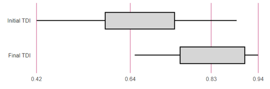 After data collection and compilation, confidence intervals and student's paired t test were calculated. The analysis demonstrated that a high proportion of the participants (93% of the sample, 25/27 participants) showed an improvement, as measured by the TDI score. Regarding the overall assessment of the TDI score, the initial mean was 67% (95% CI 63-71), while the mean after the interventions increased to a value of 83% (95% CI 80-86, p<0.001) (Figure 1). The individual analysis of each item showed that each sub-division exhibited improvement, as demonstrated by the following findings: the initial mean of the threshold (T) was 6.3 (95% CI 5.77-7.02) and the final one was 7.4 (95% CI 7.04-7.75, p<0.05), recalling that the maximum score is 8. This is equivalent to an improvement from 80% to 92%. The initial mean for discrimination (D) was 8.1 (95% CI 7.46-8.84) and the final one was 10.3 (95% CI 9.76-11.03, p<0.005), which translates into an improvement from 68% to 86%. Finally, the identification test (I), had an initial mean of 6.3 (95% CI 5.506-7.234) and a final mean of 8.3 (95% CI 7.519-9.081, p<0.001), equivalent to a 54% to 70% change. The previous information is synthesized in Table 2.