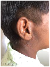 Patient aged 12 years, male, presented to our tertiary care centre ENT outpatient department, with swelling below the left ear lobule since 2 years, insidious in onset, gradually increasing in size.