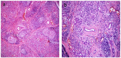 Figure 1 (a) Remarkable fibrosis, inflammatory infiltrate and lymphoid follicules, x40 H&E (b) Acinar atrophy, ductal ectasy and concentric periductal sclerosis, x100 H&E.