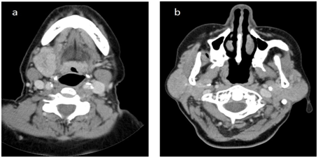 Figure 3 Axial CT scan showing the enlargement of the right submandibular gland (a) and bilateral parotid glands (b).