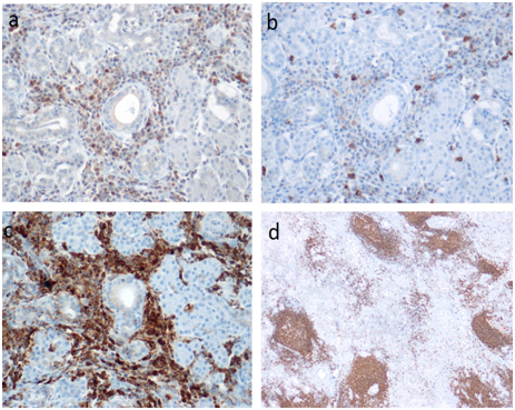 Figure 4 (a) Prominent periductal CD4+ lymphocytic infiltration, x200 CD4 immunostaining (b) Mild periductal CD8 + lymphocytic infiltration, x200 CD8 immunostainining (c) Dense plasma cell infiltration in stroma, x200 CD138 immunostaining (d) B lymphocytes in the lymph follicules, x40 CD20 immunostaining.