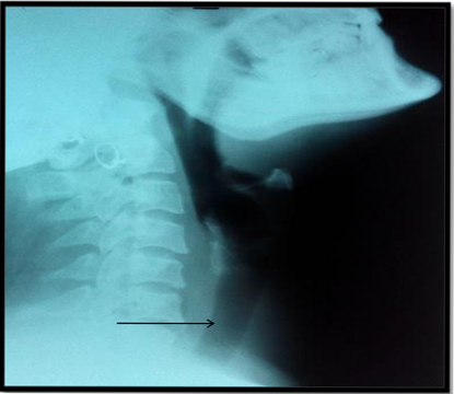 Figure 2A Soft tissue swelling (likely thyroid gland) in anterior aspect of lower cervical region with no trachea compression (arrow).
