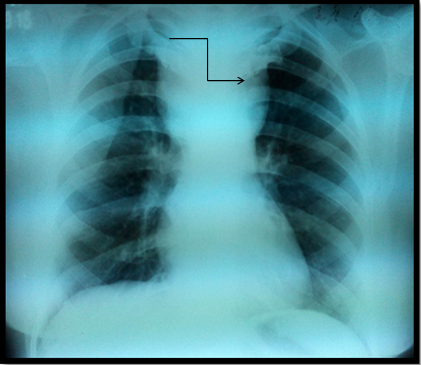Figure 2B Soft tissue swelling in superior mediastinum with well-defined lateral margins (arrow). Inferior margin is ill defined.