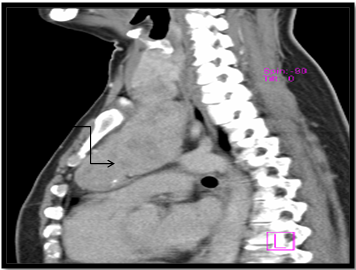 Figure 3B CT image: Sagittal section showing retrosternal extension, approx. 10cm from superior most aspect of manubrium (arrow).
