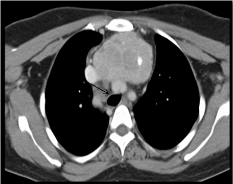 Figure 3C CT image: Axial section at the level of T2-T3 showing retrosternal extension of goitre upto the aortic arch (arrow).