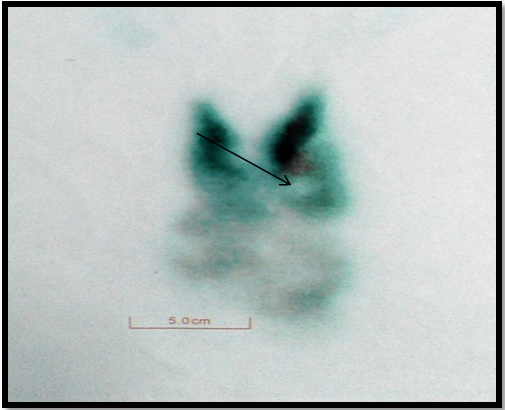 Figure 4 Tc99m pertechnate images; grossly enlarged thyroid gland with retrosternal extension. Heterogenous uptake with multiple interspersed cold regions. Overall uptake: 8% (arrow).